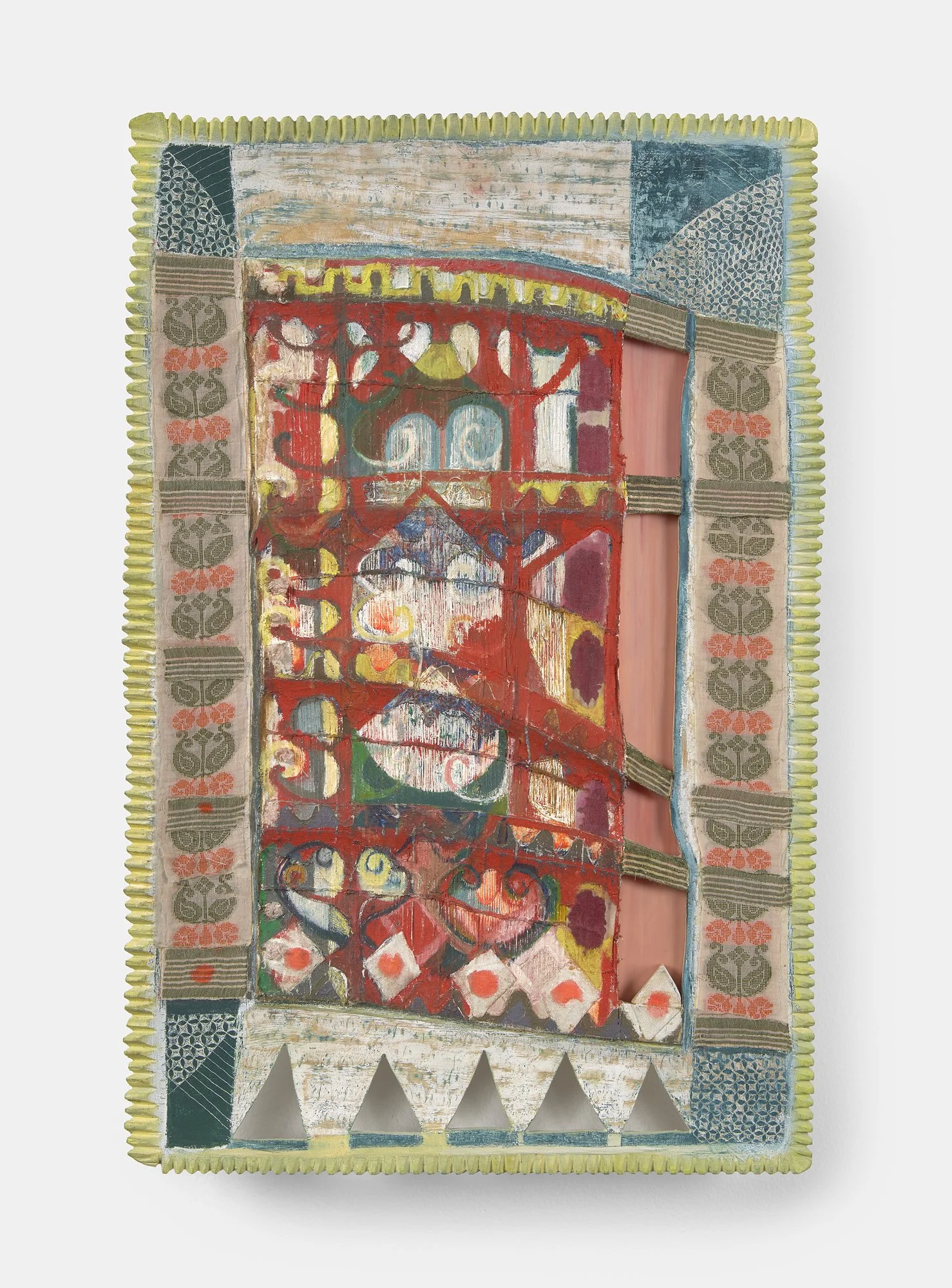 The Mountains Will Still Be Here, 2023. Painted weaving on handmade wooden armature (plywood, crochet thread, Indian cotton textile, curtain, oil paint). 28.5 x 19 x 2 inches