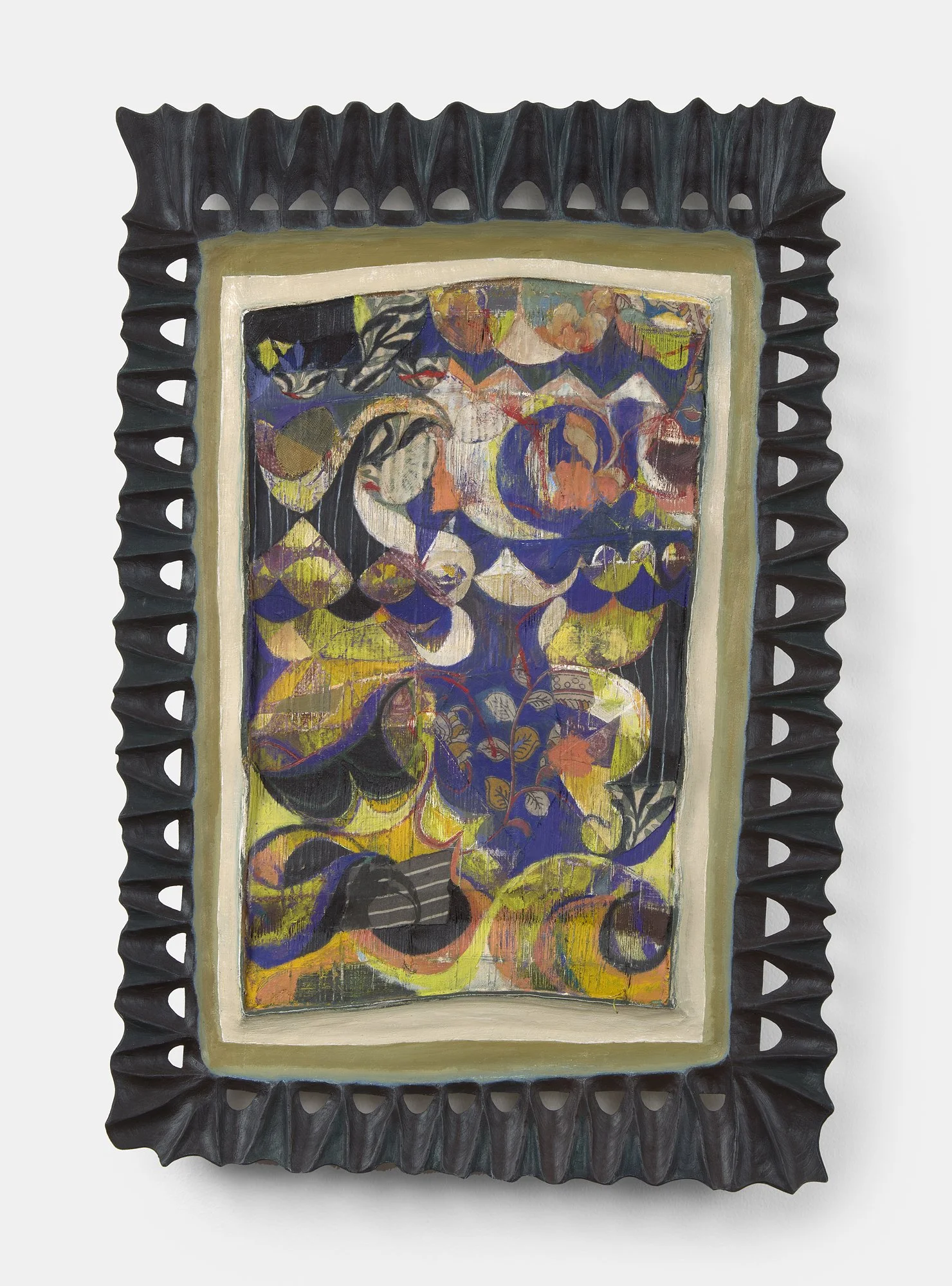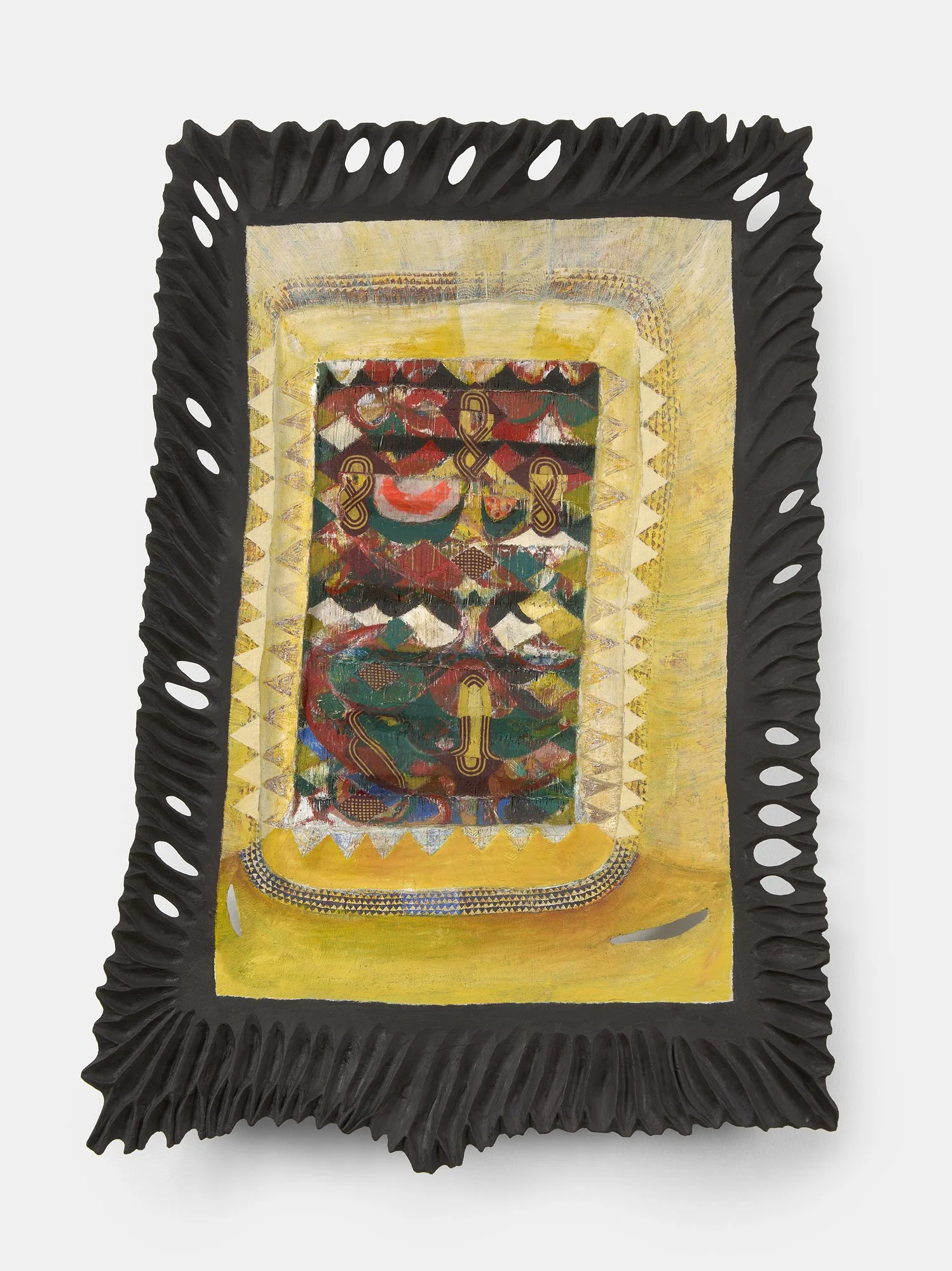 Untangle Me, 2023. Painted weaving on handmade wooden armature (plywood, crochet thread, Dutch wax fabric, curtain, nightgown, oil paint). 31.75 x 21 x 3 inches