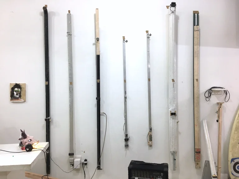 Bainbridge’s interdisciplinary practice culminates in this exhibition featuring sculptural works that are interactive and meant to be played with. Stroke and pluck the mother unitars with their primitive single strings attached to their animal amplifier offspring by electrical umbilical cords. A vibrational birthing, producing, emitting, reverberating. Overhead, tiny, kinetic flies orbit and buzz, buzz, buzz, buzz to the point of delirium. Everything in the universe is vibrating and these artworks become one by joining in. One of the sutras of the Aquarian Age says, "Vibrate the cosmos and the cosmos shall clear the path". Clearing the path could be a mystical parting of the clouds—but it could also be an avalanche, a lava flow, a tidal wave, an earthquake. The pink bird, the cardboard dog, the suspended whale, the owl, the hyena bust, these musical sculptures set the stage for a potential performance. The bugs are the audience, the observers, bearing witness to the chaos and conjuring.