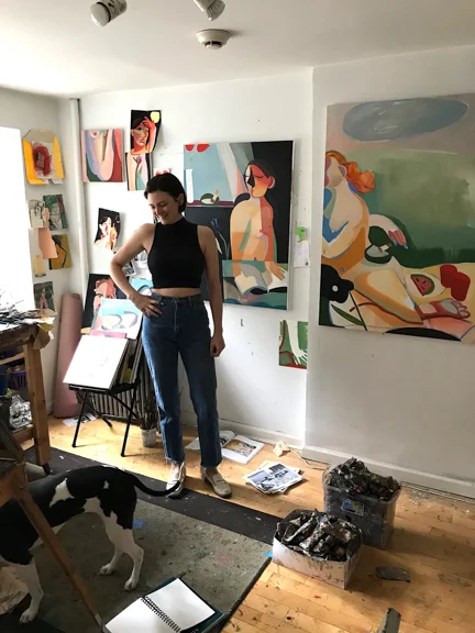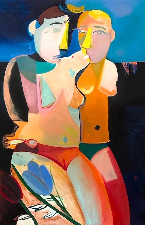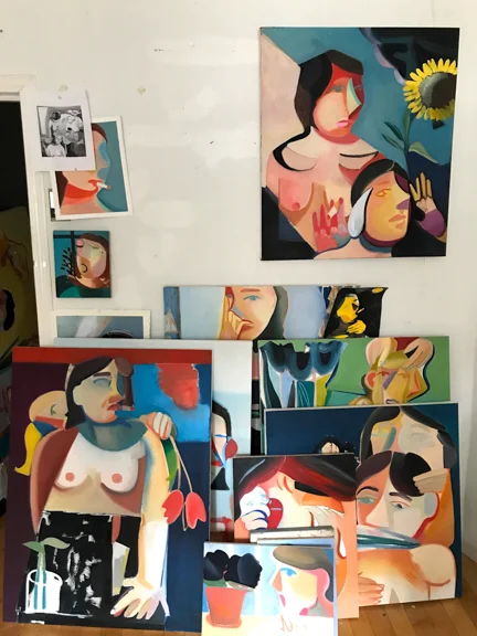 These paintings are about the anxiety around physical intimacy, the risks inherent to knowing another person. I paint mostly women, because that is the experience I feel best equipped to discuss. I explore these ideas by culling from Western art history, and look to Analytic Cubism, the Italian Renaissance, the Chicago Imagists, the Bay Area painters–any moment when the female figure has been used to indicate an otherwise hidden psychological position. My process is disorganized and frenetic, with an emphasis on the tactile and sculptural quality of oil paint. I pour, scrape, and build up thick fields of impasto until an image is realized. I search for sources on Instagram and in museums and books, and am most strongly drawn to points of physical pressure–two vases touching in a Morandi, Georgia O'Keefe's hand resting on a cow skull–elliptical moments that I hope to capture and merge with the cast of characters I paint, characters who are, ultimately, proxies for myself.