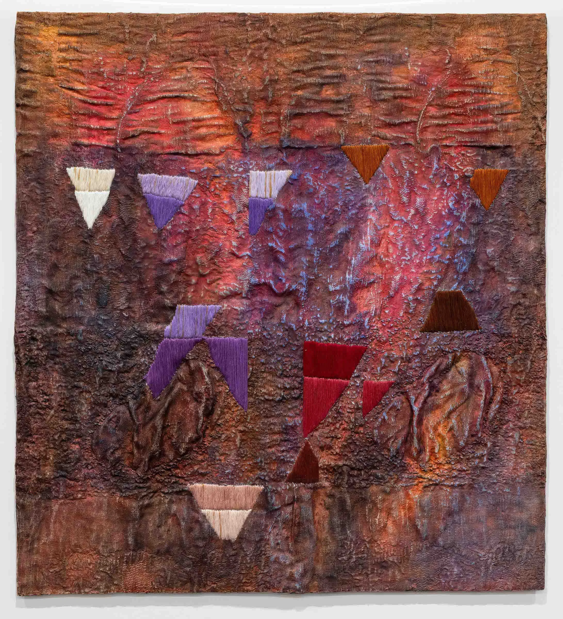 I gravitate towards images and experiences that are somewhat mysterious and take time to unravel. Ones that force me to be present, watching, sensing, and open to wonder. I am curious about the point where the physicality of my chosen materials (paint, thread, beads and fabric) gives way to a larger intangible experience. My ideal images flicker between being solid, stable, physical things and something elusive I can’t quite gather, touch, or confine. I enjoy switching back and forth between looking at the surface of an image with my eyes to relaxing into a deep immersion, or sensing of an image, with my body. To me, this repeated dive into full body immersion and presence is grounding. I seek it as I move through the world, and I seek it as I make my art. I look forward to continuing to work in the studio without any predetermined expectations. When I slowly build images, I root myself in my body and heighten my sense of being here.