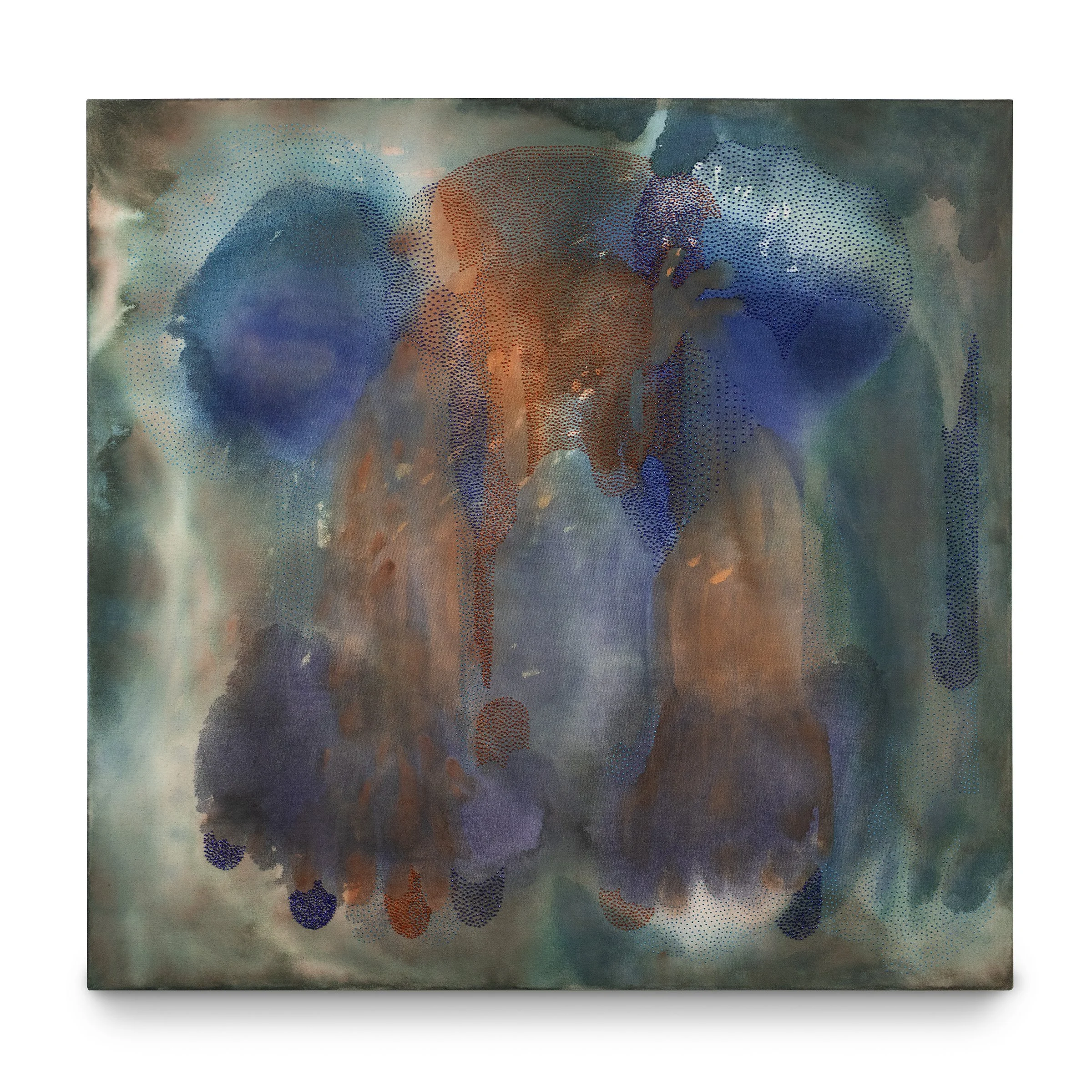 Night Watch: Smoke & Fog, 2025, hand-embroidery, glass beads, acrylic paint on canvas, 46 x 47.75 Inches