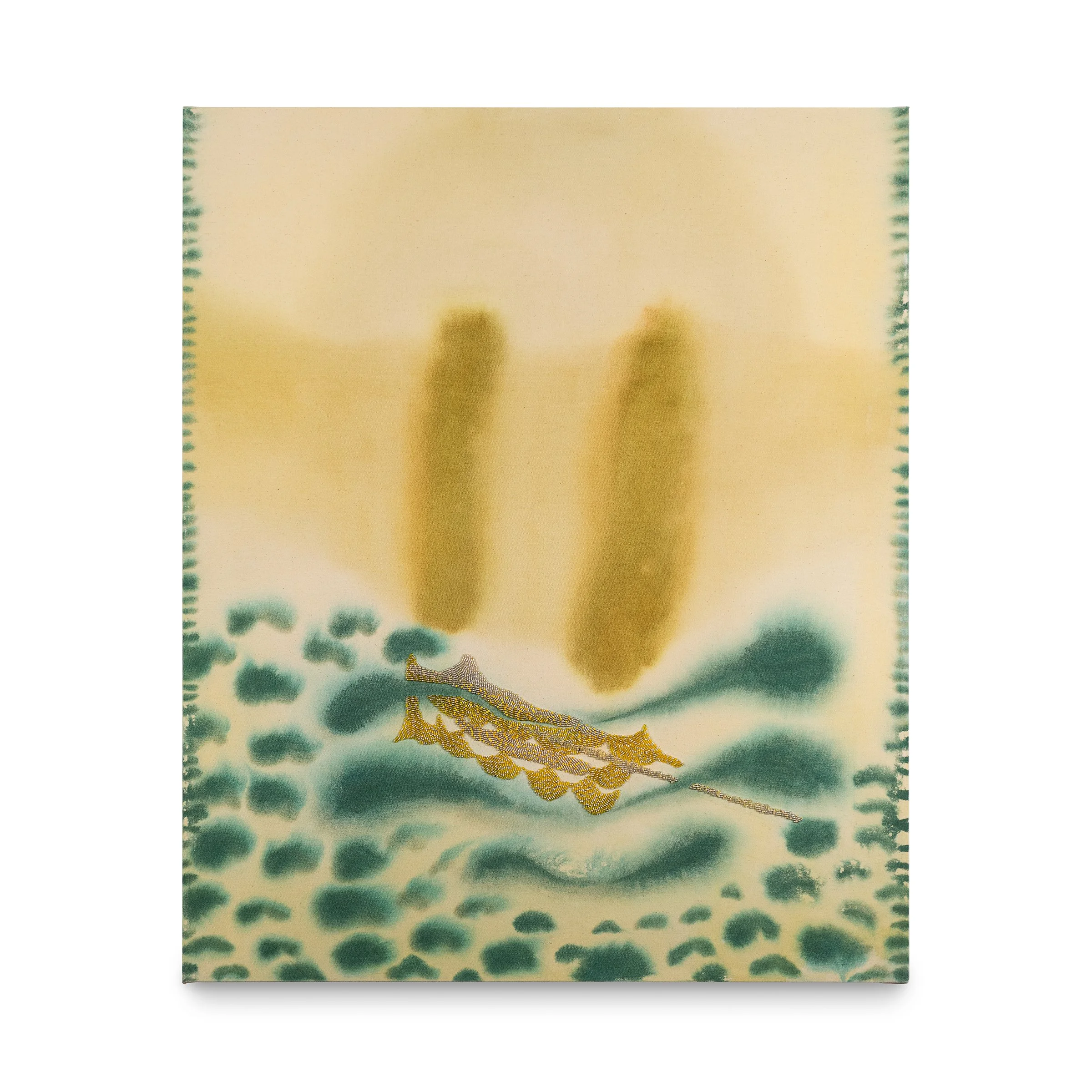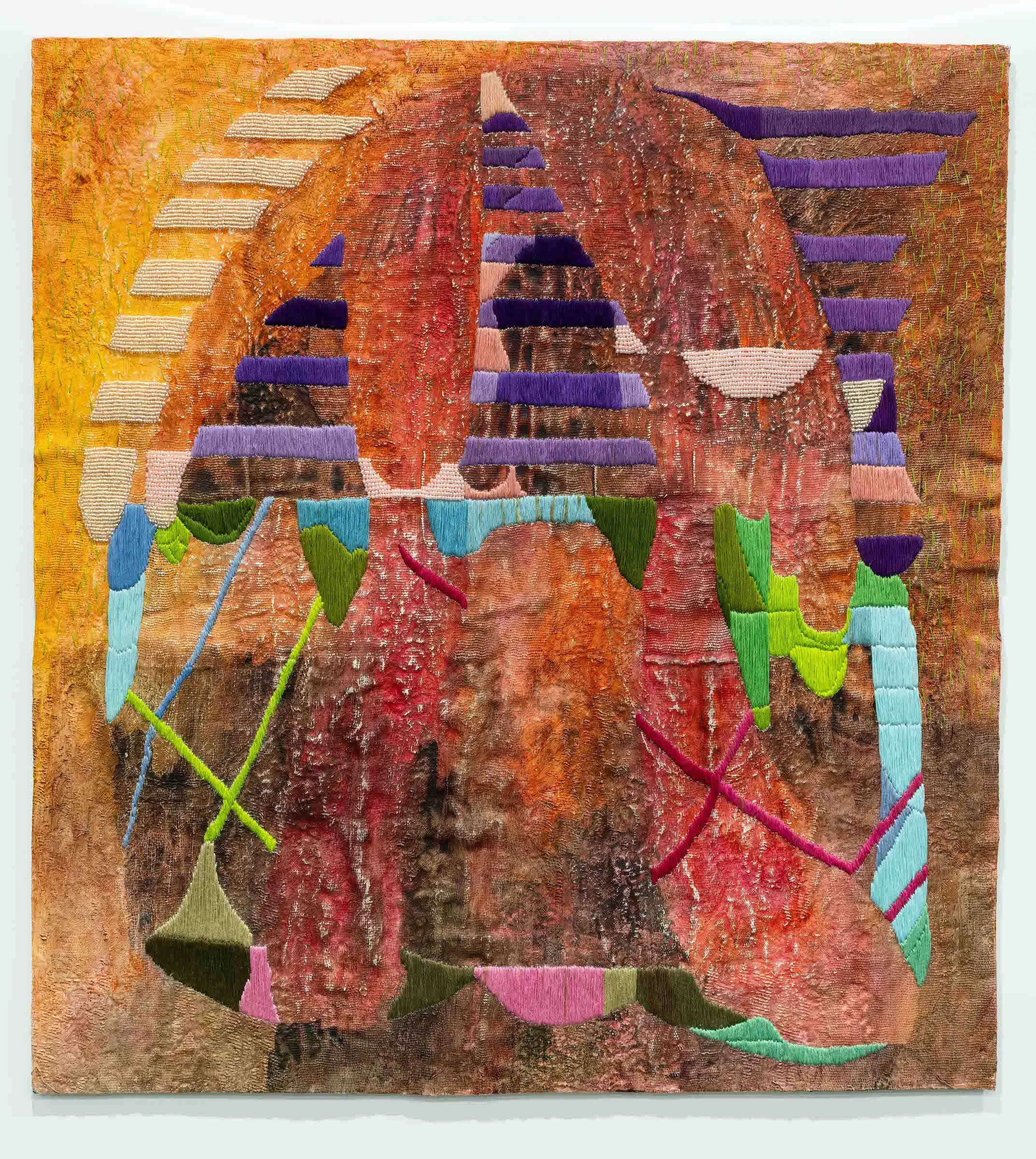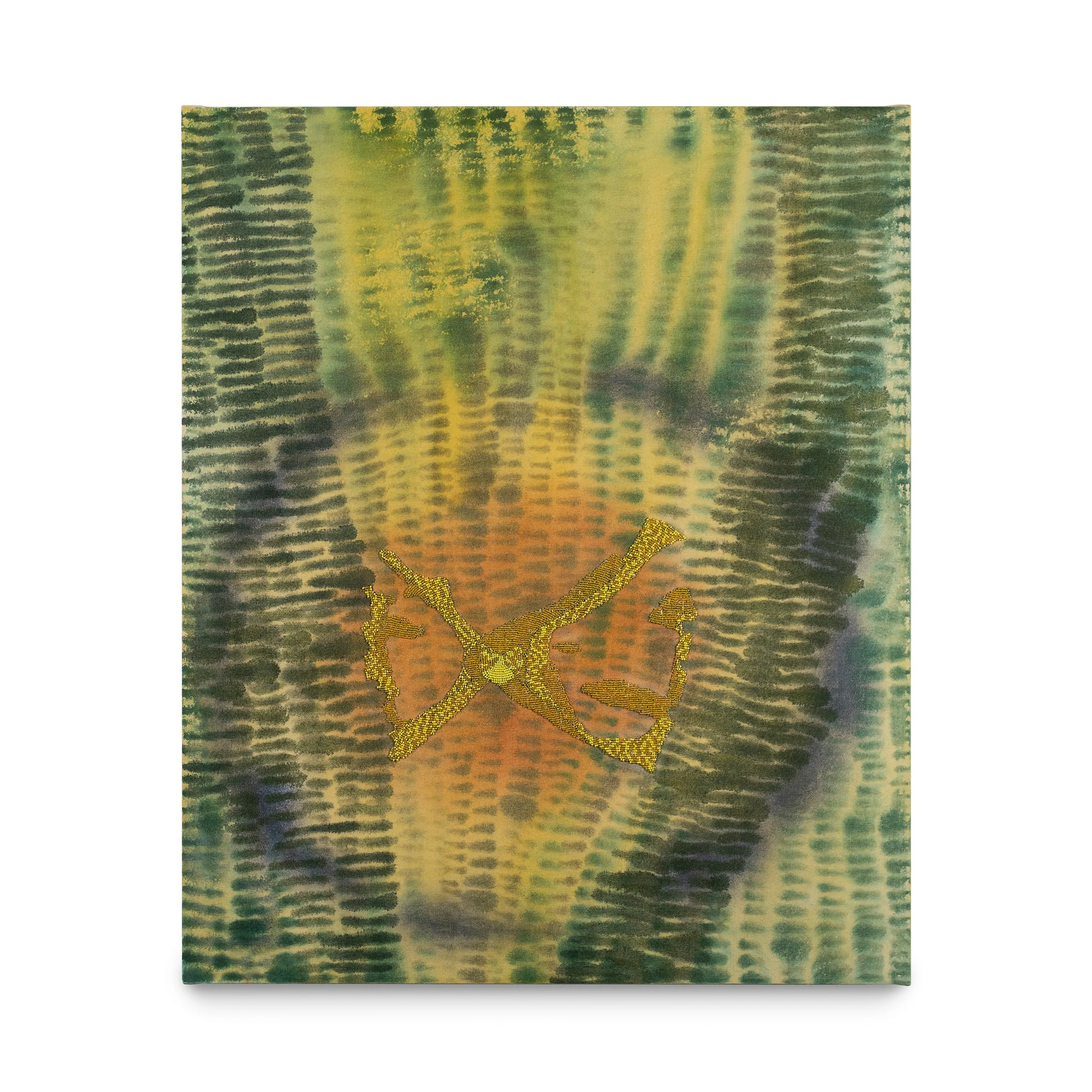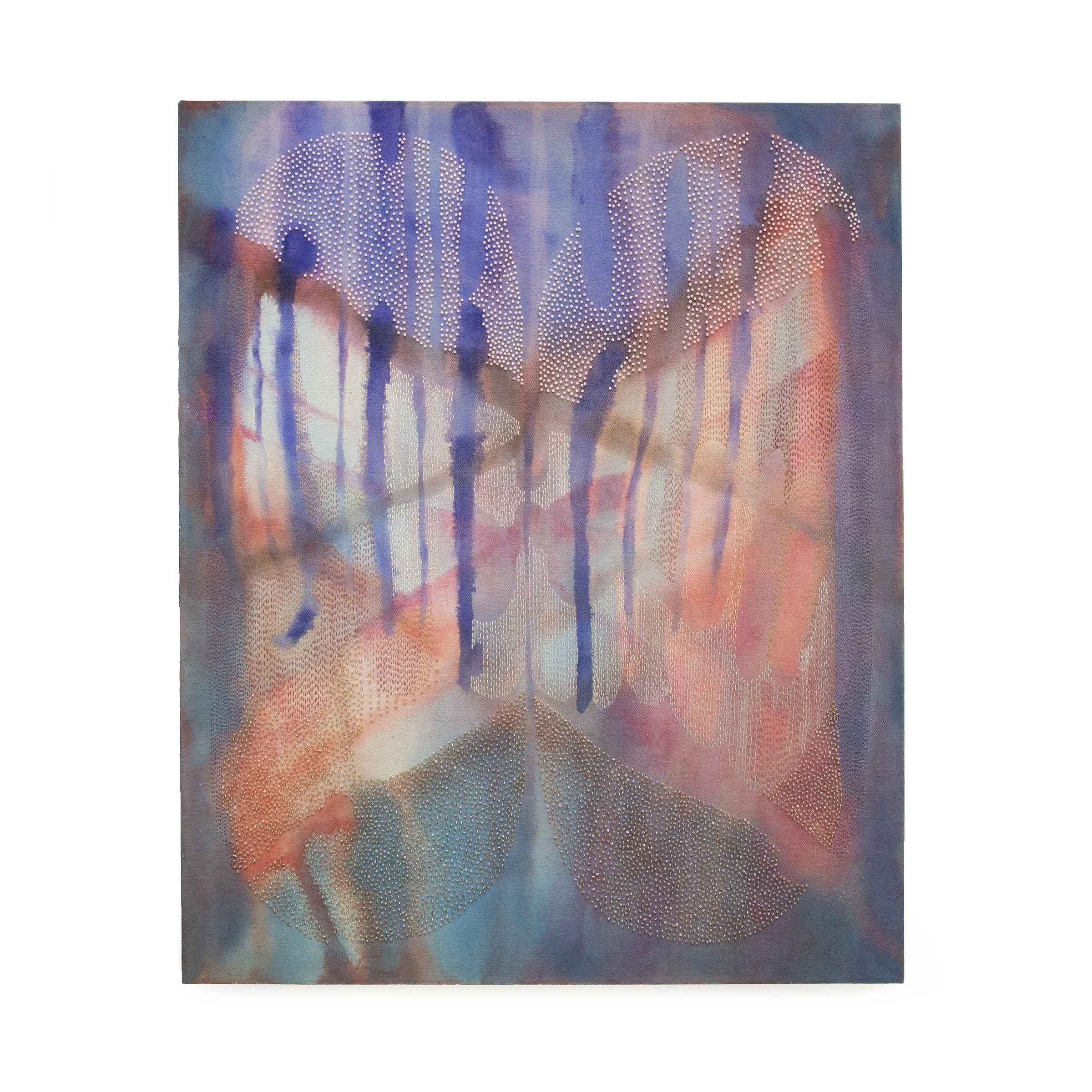 I start by applying thin layers of watery paint to damp, unprimed canvas. These colorful stains are gentle and responsive. Nothing is planned in advance. The painted marks soften and bleed depending on the wetness of the canvas. Later, I embellish the painted surfaces with repetitive marks, stitches, and beads. I work intuitively, but also slowly. Each piece takes months, sometimes years to unfold. I patiently work my surfaces until their dream-like worlds seem to breathe on their own, pulsating with color and light. The most successful images feel alive, vibrating with an energy as if they grew from within. At the same time, they contain measurable evidence of my hands at work. This has been my approach since 2022. Before that, I was making organically shaped fiber collages. These older works were more tactile and chunky, incorporating a mix of painted textiles, knitting, crochet, hand-embroidery and beading.