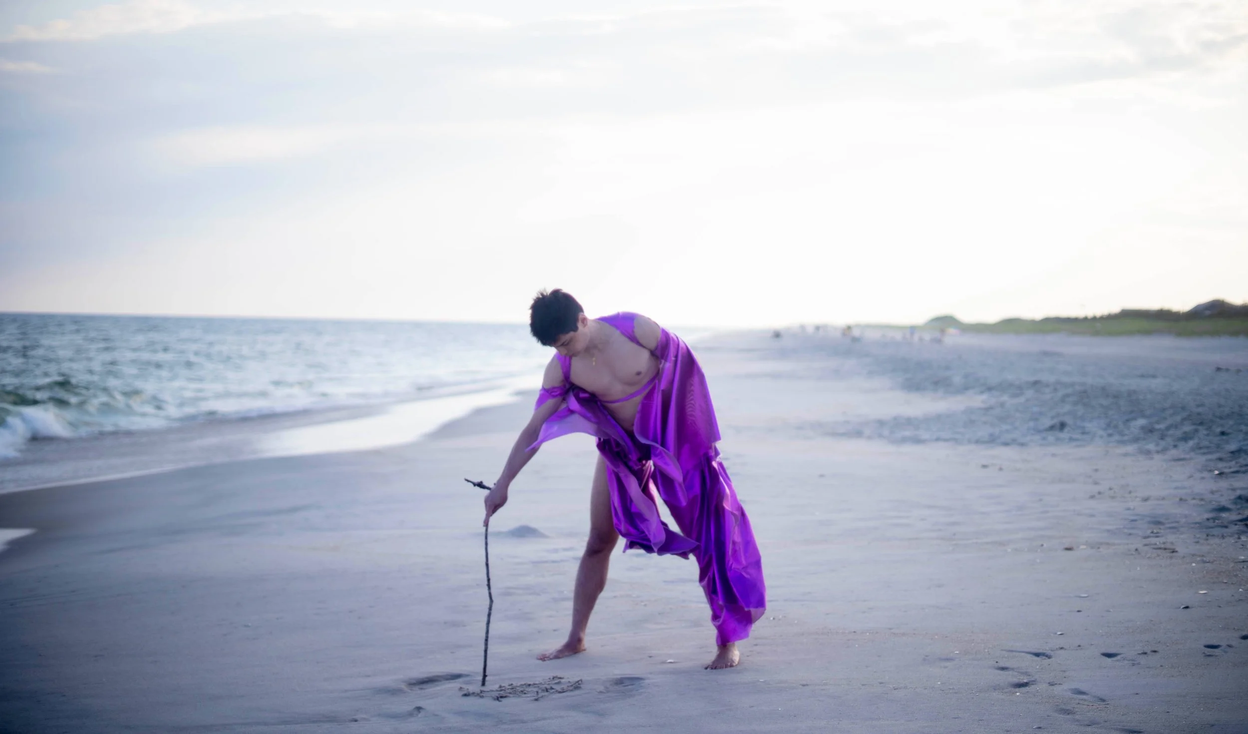 FIAR’21 artist Vincent Chong performing “Whispers to the Ocean in Fuchsia” on Cherry Grove Beach. Photo: Rikki Porter.