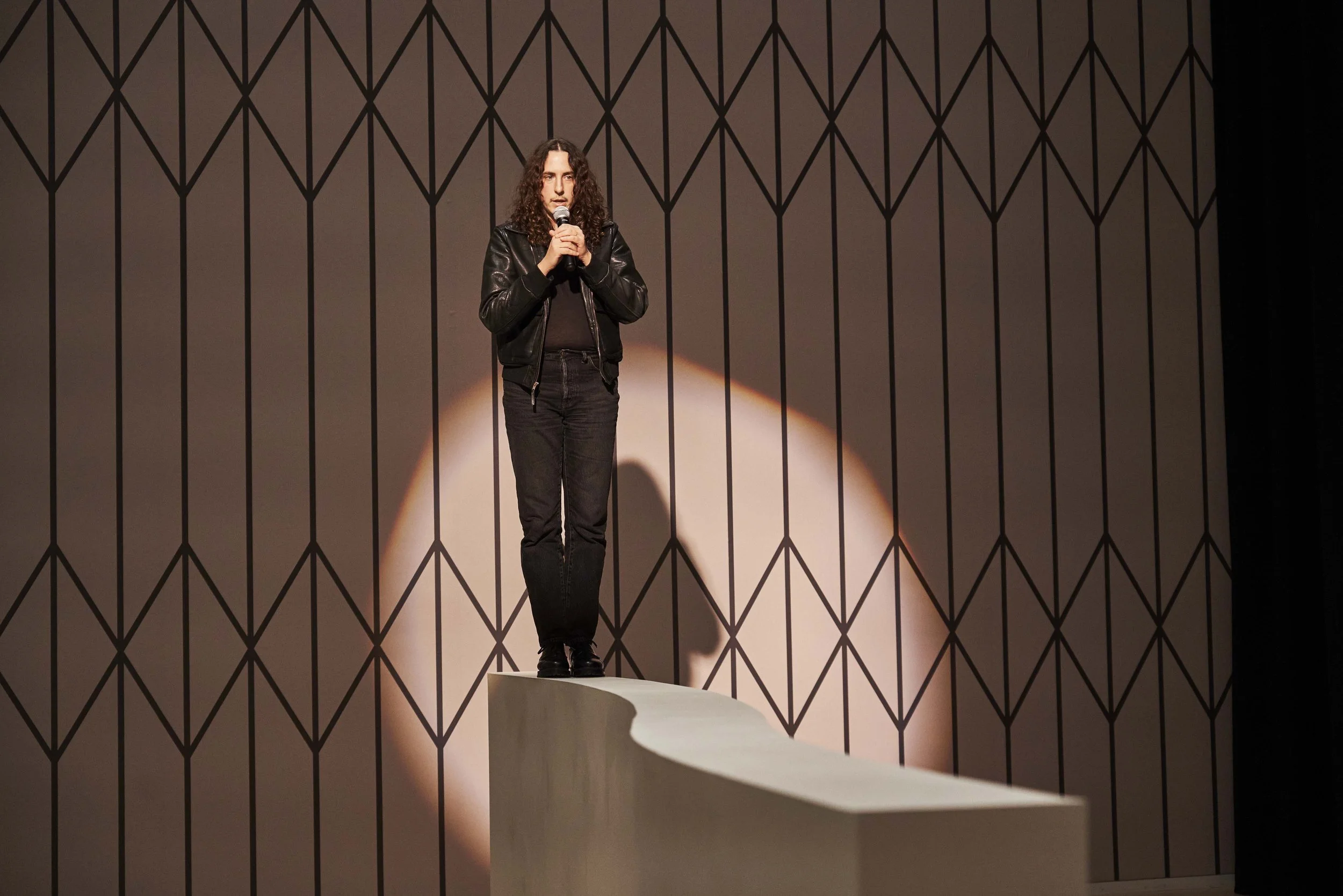 At The Henry in Seattle, I created a performance to open the show. I started behind this black, pleated curtain about thirty feet long. I was walking back and forth behind the curtain, and then I started singing. I came out from behind the curtain and activated different architectural features I had built. When I exited through the curtain, I tripped this motor, a robotic device that simulated my movement. My movement was replaced by this machine. It gave the impression that there was something or someone walking behind the curtain as if someone else might come out onstage, like when there’s a spotlight on, and someone is stumbling to find the opening in the curtain. That’s a comedic moment. It’s pretty funny. I think about Jack Goldstein’s short film, Metro-Goldwyn-Mayer (1975), which repeats the lion roaring from the beginning of MGM films.