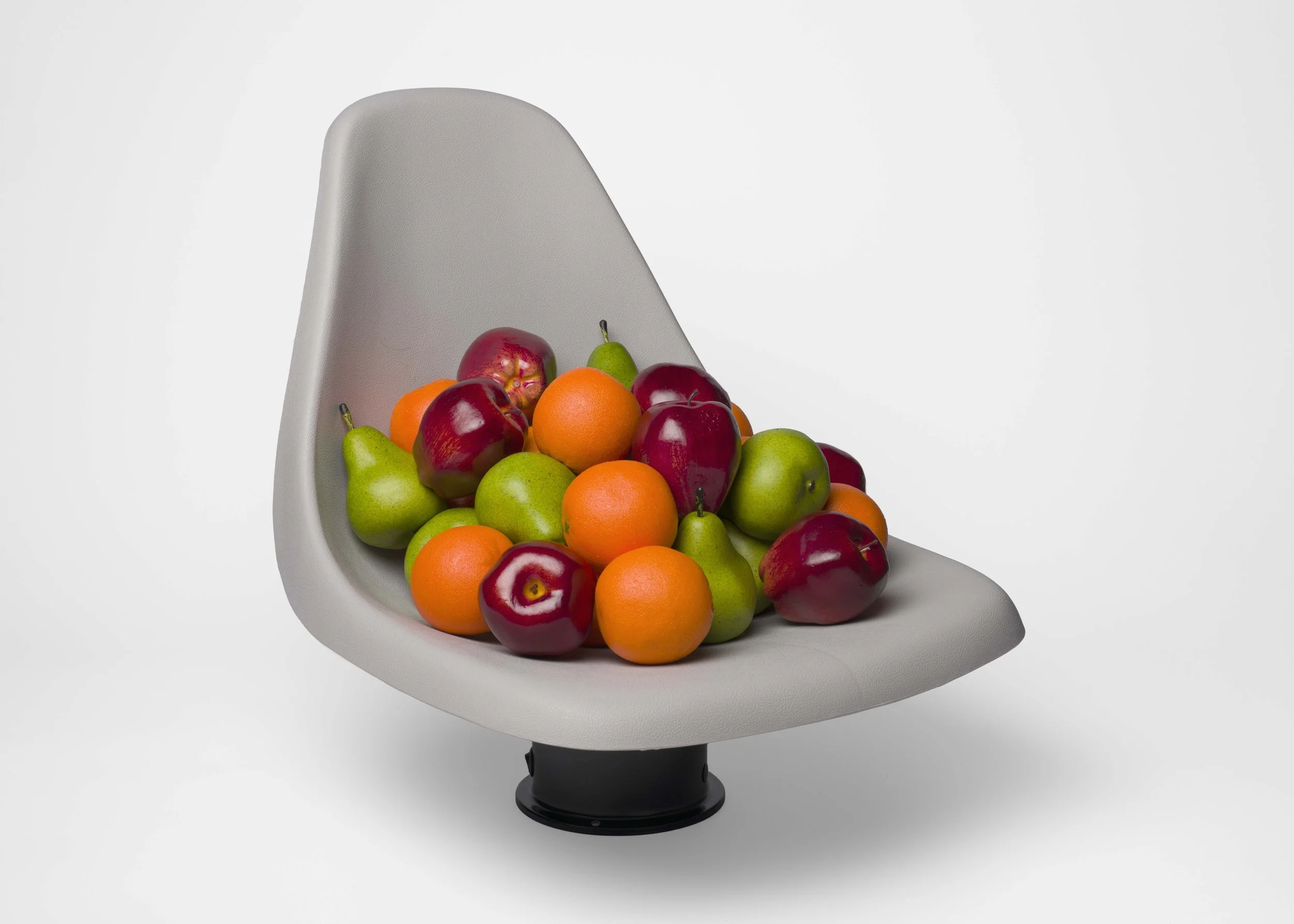 MB: They were seats from boats. They were small enough that they almost felt like elementary school chairs. They were piled up with apples, pears, and oranges. I was thinking about binaries, the non-binary pear, and body shapes. Are you an apple shape, or are you an orange shape? Apple shape or pear shape? Apples and oranges! The chairs were very slowly spinning on motors. Two of them were spinning clockwise, and two of them were spinning counterclockwise. They were cranking the show.