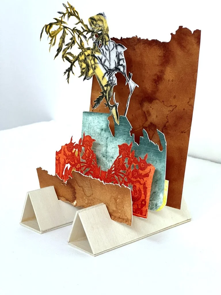 Past That Hill (side view), 2022. Tunnel book: etchings, paintings, drawings, cut paper and birch wood. 6 x 3 x 4 inches.