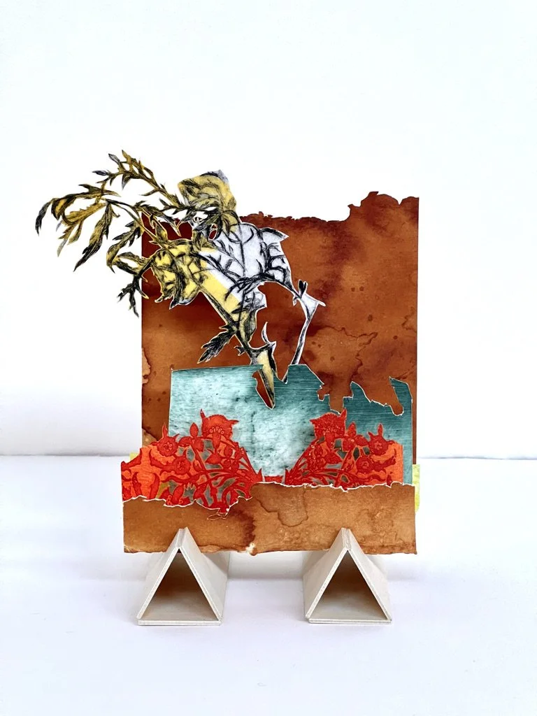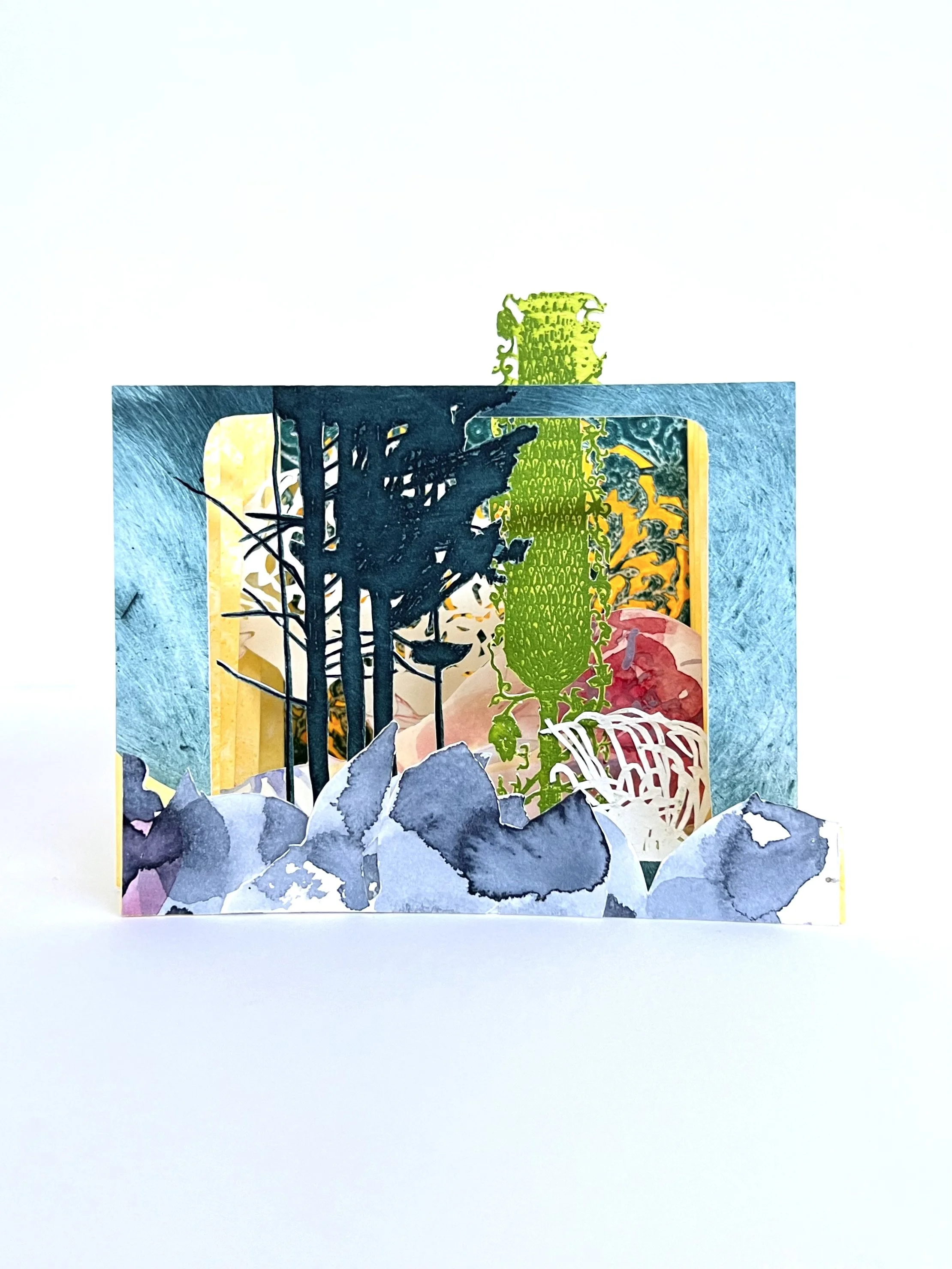 Past That Hill, 2022. Tunnel book: etchings, paintings, drawings, cut paper and birch wood. 6 x 3 x 4 inches.