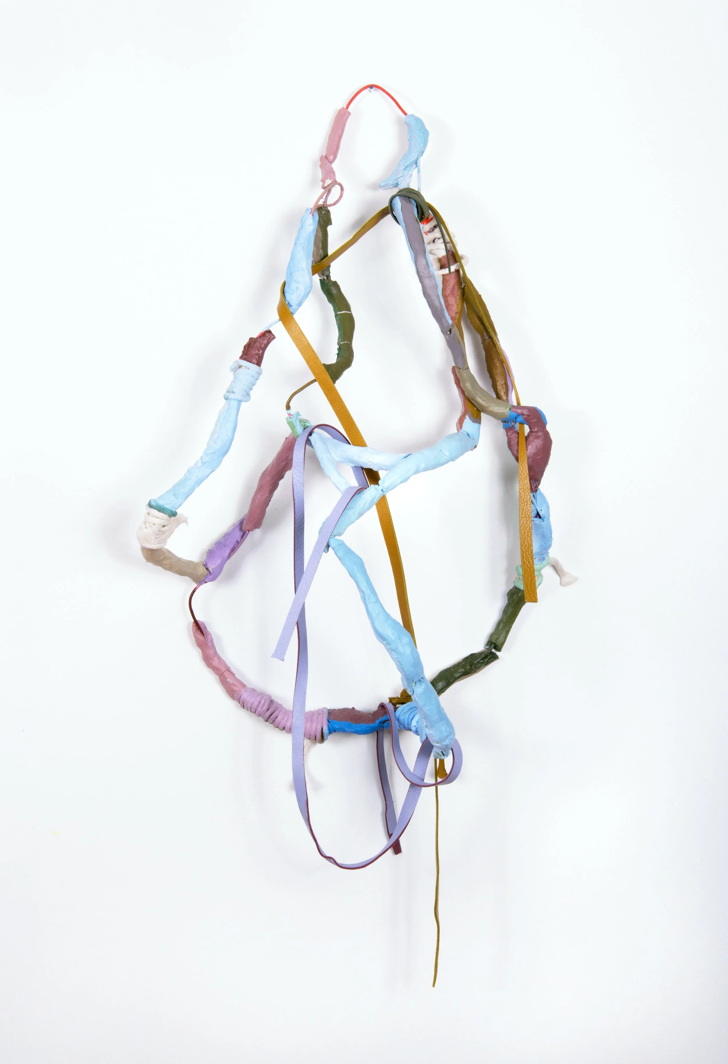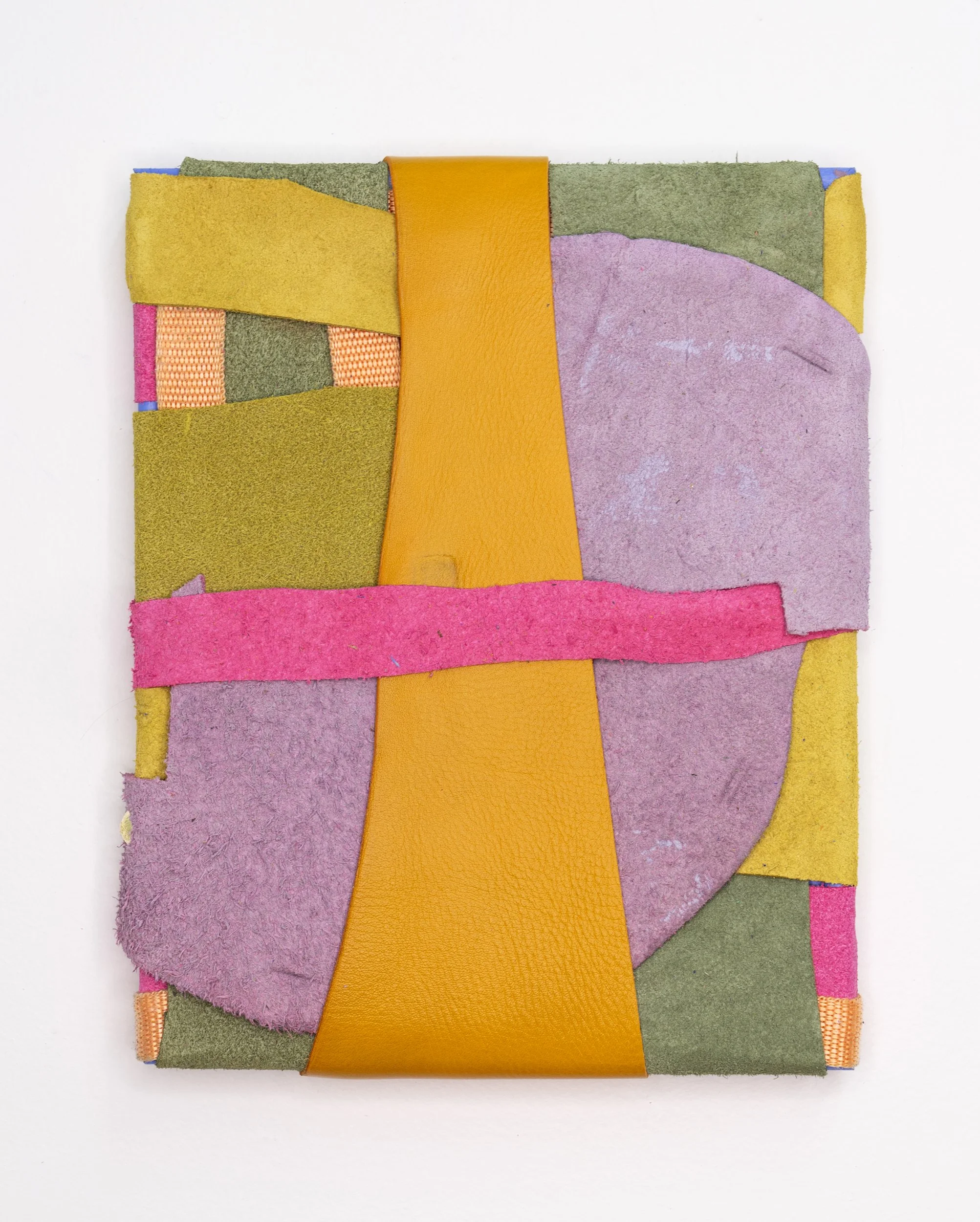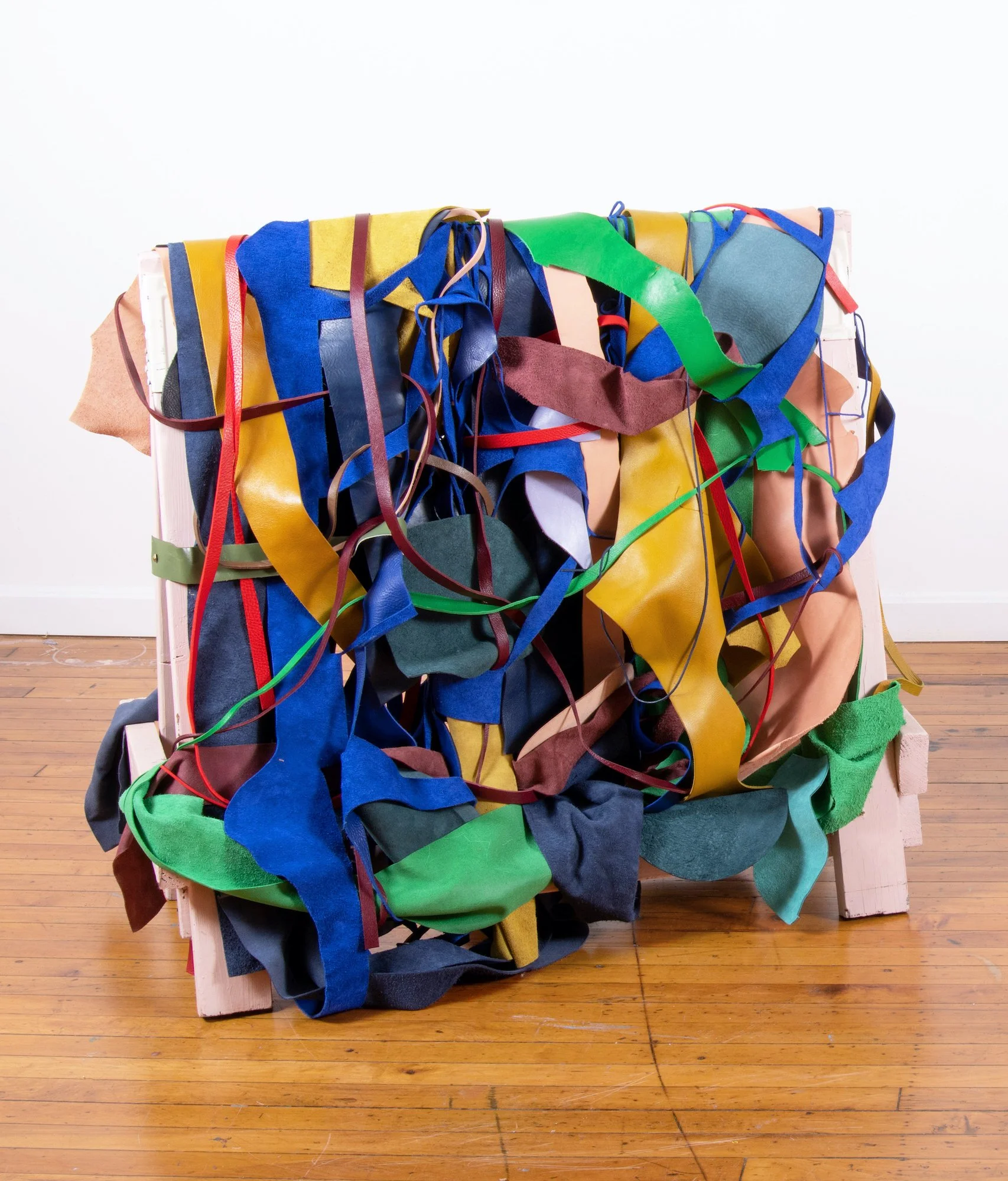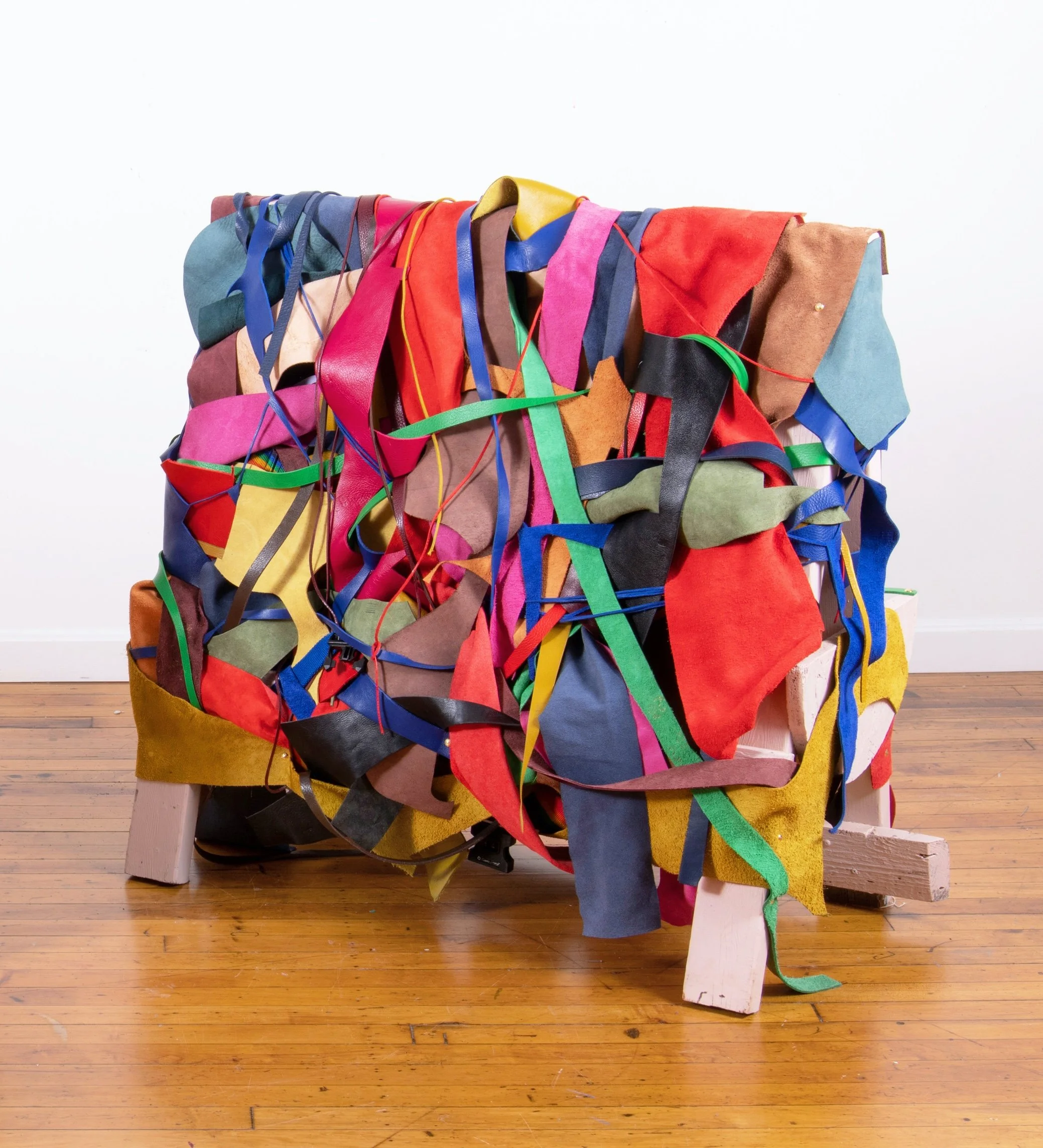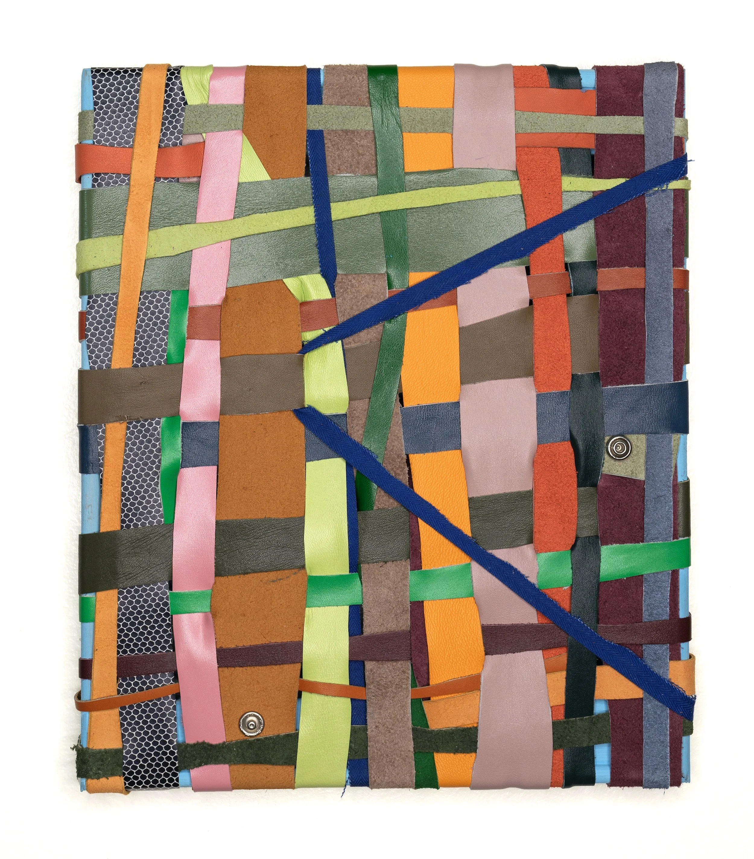 I make abstract, two and three-dimensional paintings propelled by color and movement. Temporarily static, the works are multi-sided and often intended to be rechoreographed. I build the work with leather, clay, wire, piping, and other found, recycled, and inherited materials. I’m interested in the stories that materials and objects carry, where they came from, and whose hands or generations they have passed through. Informed by a tactile sensibility, I gather, cut, weave, bind, and embed materials, often arriving at nonlinear processes, like covering copper wire in clay only to watch it crack. A current of grief runs through the objects I make. Using leather, piping, wire, and paint, I mend and reinforce parts of the new forms and render these repairs visible. Hardware plays a similar role in the work—upholstery tacks, snaps, and brads become steccato anchors and hinges, marking the work's construction. I’m suspicious of linear processes. Not having an expected outcome requires me to be present with the work and open to its expanded possibilities. Color is both playful and poisonous. I embrace clashing and incongruous colors and the thrill of trying to make them fit together.