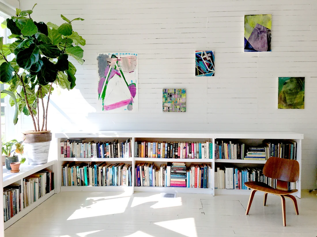I like the look of the walls too. It sets everything that hangs on those walls in relation to a rural history. And like you said an aesthetic, which I think of as warm and friendly and familiar. Are the walls a determining factor for the work is such a good question—I think they hold so much possibility… Because the interior is expansive and floor-to-ceiling white, the space can be both casual and formal. The ceilings are 18 ft. high and the furniture sparse, so when visitors walk in they are surprised how big it is inside. I do enjoy seeing shows relate to the specific walls and bookcases. Peter Shear curated a 13 person show in 2016 where some paintings were hung and some casually rested on the shelf. I liked the way the paintings had a direct relation to the book cases, it seemed to suggest to the viewer: you can pick this up and read it.